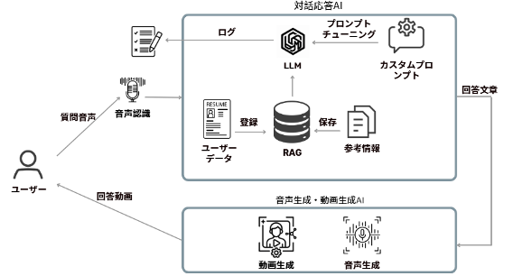 AIdeaLabのオーダーメイド型AIアバターは、本人らしさの再現に注力しています。その中核となるのが、動画と音声を生成するAIです。自然な表情や口の動き、話し方を再現するために、あらかじめ収集した素材動画や音声をもとに、前処理やノイズ除去を施したうえで、専用のモデルを構築しています。対話応答AIでは、発話内容がその人らしく感じられるよう、プロンプト設計によって一人称や語尾、話し方のクセなどを細かく調整し、RAG(Retrieval-Augmented Generation)を活用して知識となる情報を組み込みます。これにより、質問に対してその人物ならではの回答が自然に返ってくるよう設計されています。