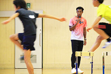 当日は、ラシッド選手自ら子どもたちにハードルの楽しさを伝えてくれる特別な日。まずはラシッド選手がデモラン。子どもたちの前で力強い踏み込みで軽やかに跳んで見せると、会場全体から感嘆の声と大きな拍手が上がります。「ハードルを飛び越えるときは、なにも怖がらずに自然体で跳んでいくことが大事。跳びこえるときは頭が上下に振れないようになるといいです」と、一人ひとりのハードルを跳ぶ姿を見て指導をしました。子どもたちが真剣に取り組む姿を見て、指導はさらに踏み込んだものに。「ハードルの間の歩数を意識して」、「スタートではセット時から力を入れる部分を意識してみて」など、自身も実際の競技で意識していることを伝授していました。