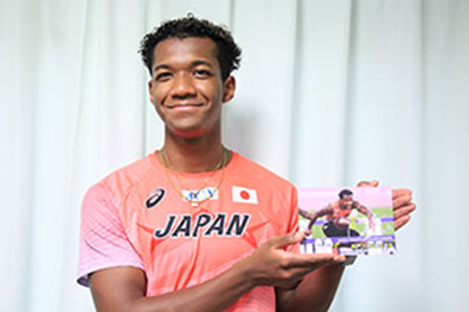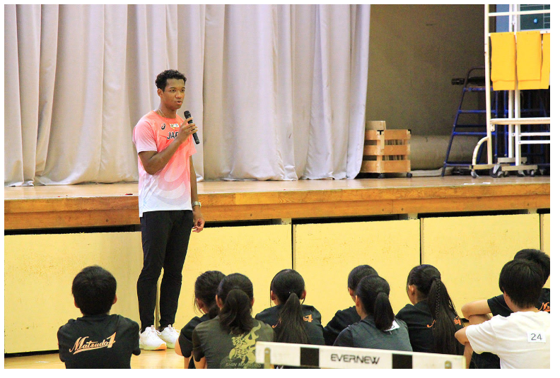 交流イベントの最後には、「これからもハードル走だけでなく、陸上を楽しんでもらえたら」と子どもたちにメッセージを送ったラシッド選手。参加した子どもたち一人ひとりと握手しながら、ラシッド選手のサイン入りカードを手渡しました。憧れの選手からのサプライズに、子どもたちの驚喜する様子が見られました。その際に、ラシッド選手が触れたのは松戸第一中学校の生徒たちが着る「MatsudoMatsudo1」と書かれた練習着。「僕もそれを着て練習していました」と、思い出のある体育館とともに当時を懐かしんでいました。イベントの最後には参加した子どもたちと集合写真を撮影。ラシッド選手が世界陸上に出場する際に、後輩である松戸第一中学校の生徒が応援メッセージを書き込んだ日の丸の旗と一緒に撮影し、イベントは大盛況に終わりました。イベント終了後、子どもたちの様子について振り返ると「この短い時間でもきちんと成長が見られて、こういったイベントが実施できてよかったです」と語りました。