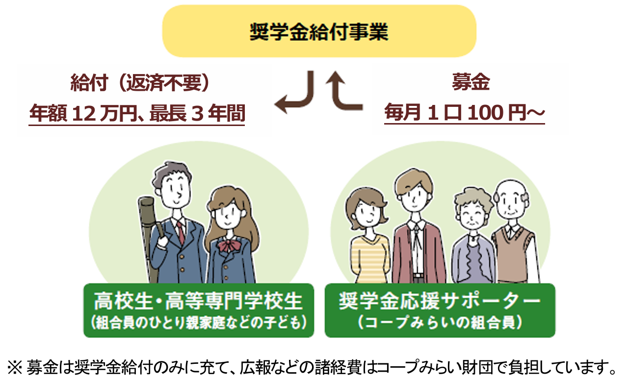 対象者 : ひとり親(または両親がいない)家庭の高校生(2026年4月に高校に入学する方、および新2年生・3年生に進級される在校生)で、保護者がコープみらいの組合員