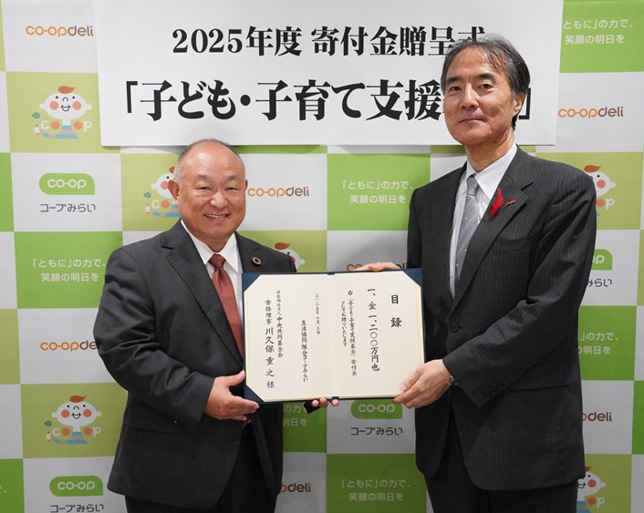 2025年度の「子ども・子育て支援基金」寄付金贈呈では、社会福祉法人中央共同募金会へ1,200万円、認定NPO法人ハンガー・フリー・ワールドへ400万円、認定NPO法人アジア・コミュニティ・センター21へ400万円、合計2,000万円を寄付いたしました。2025年度は、2025年1月から5月に「はがき・切手回収キャンペーン」を実施し、2万2,817人の組合員にご協力いただきました。