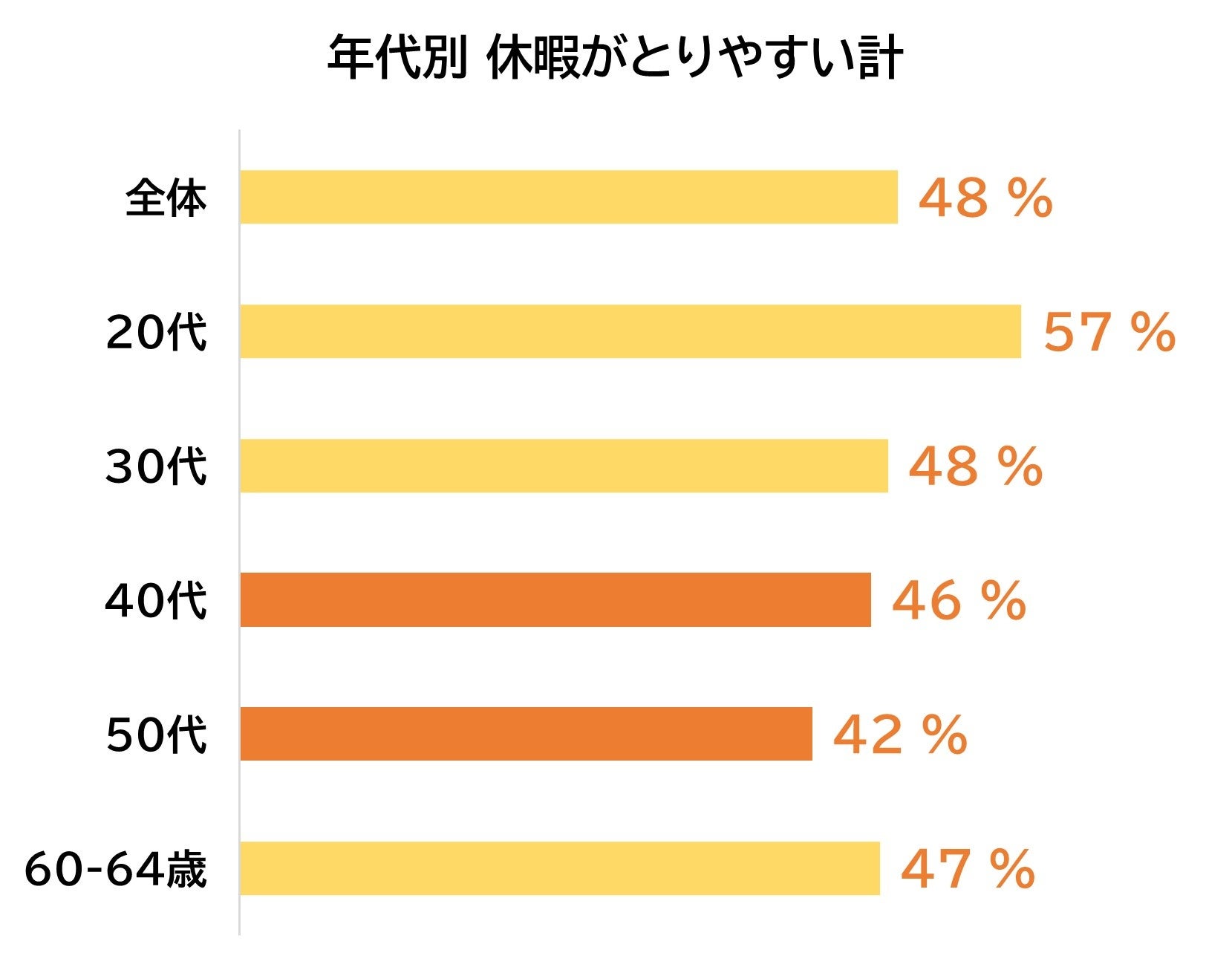 また、会社で重要な役職を任されやすい40代~50代は、20代~30代の若年層と比べると「休暇を取得しやすい」と答えた割合が低く、責任世代になるほど休暇を取得しづらいと感じる傾向にあることも分かりました。