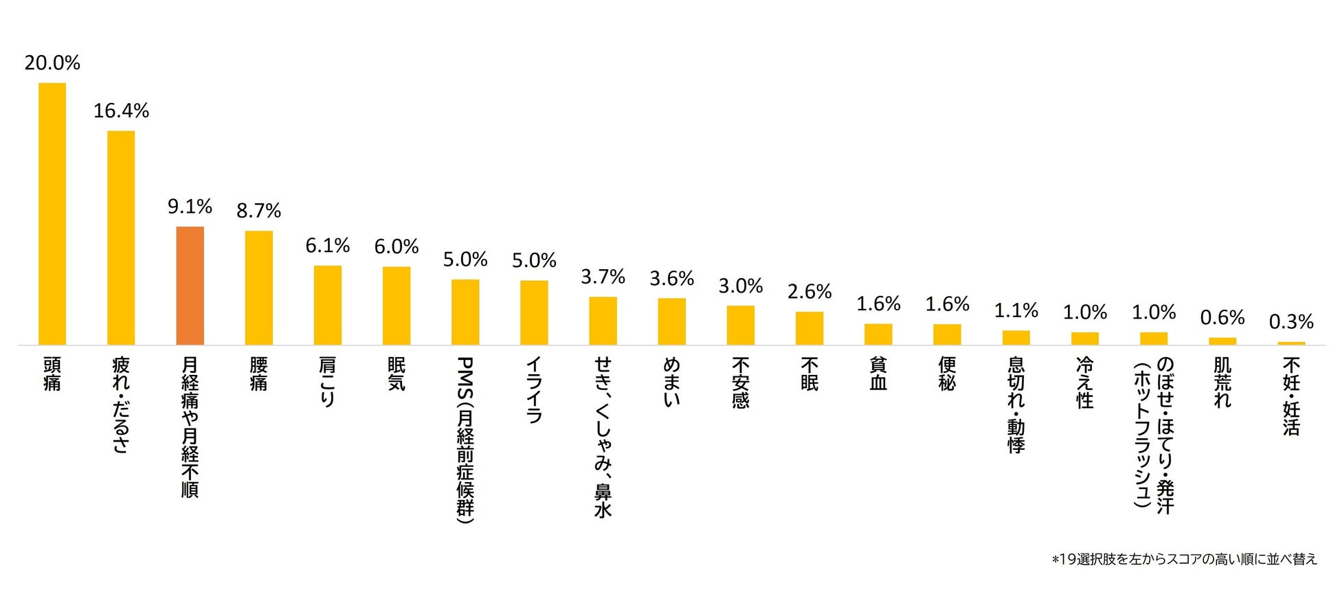 仕事に影響が出ていると答えた方に対し、具体的にどのような症状が原因か尋ねたところ、「頭痛」「疲れ・だるさ」に次いで、女性特有の症状である「月経痛や月経不順」が上位に入る結果となりました。