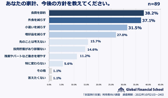 予算オーバーかつ、今後の家計に不安を感じている89名に、家計の今後の方針を訪ねたところ、削減するのは1位「食費」(38.2%)、2位「外食」(37.1%)、3位「お小遣い」(31.5%)となりました。