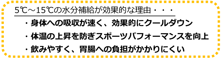 ★サーモスが行った実験の通り、スポーツ時の飲料は、5℃~15℃だと効率よく体温を下げるので、その温度帯の飲料をこまめに補給すると良いでしょう。