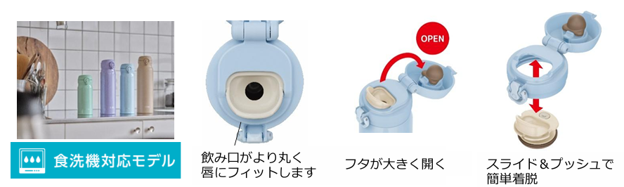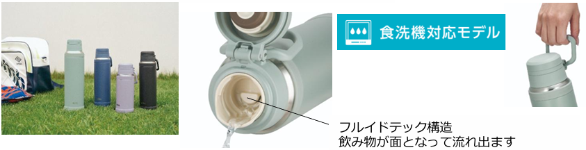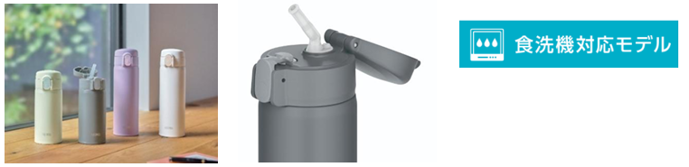 『真空断熱ケータイマグ(JOYシリーズ)』は飲み口に、新構造となる「フルイドテック構造」を採用した温・冷対応のケータイマグです。大容量サイズの水筒で飲みものを飲む場合、中身が多く水筒を傾けてもスムーズに飲める飲み口となっているため、温冷問わず滑らかな飲み心地を実現したアイテムです。さらにキャリーループがついているので、スポーツ時でもラクに持ち運びすることができます。