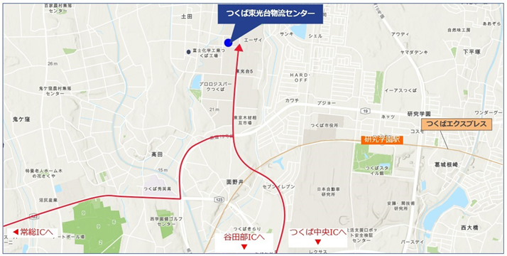 つくば東光台物流センターは、圏央道「つくば中央 IC」出入口から約5km、常磐自動車道「谷田部 IC」出入口から約9kmに位置しています。関東全域への配送や東京都心まで車で約1時間の利便性を活かした都心への配送の両方に対応可能となっています。
