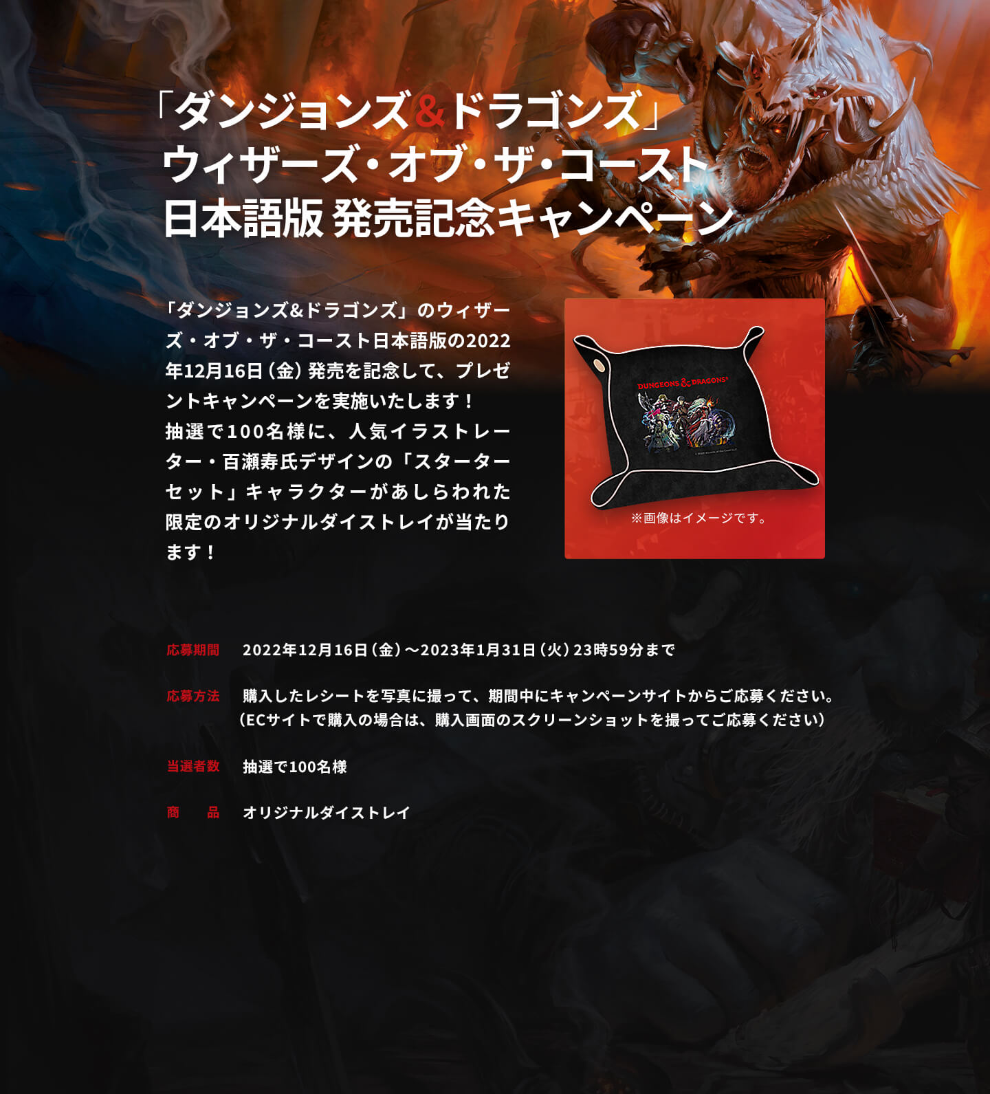 「ウィザーズ・オブ・ザ・コースト」 は、「ダンジョンズ&ドラゴンズ」WotC日本語版の発売(12/16)を記念して、『「ダンジョンズ&ドラゴンズ」ウィザーズ・オブ・ザ・コースト日本語版 発売記念キャンペーン』を2022年12月16日(金)から2023年1月31日(火)まで実施します。