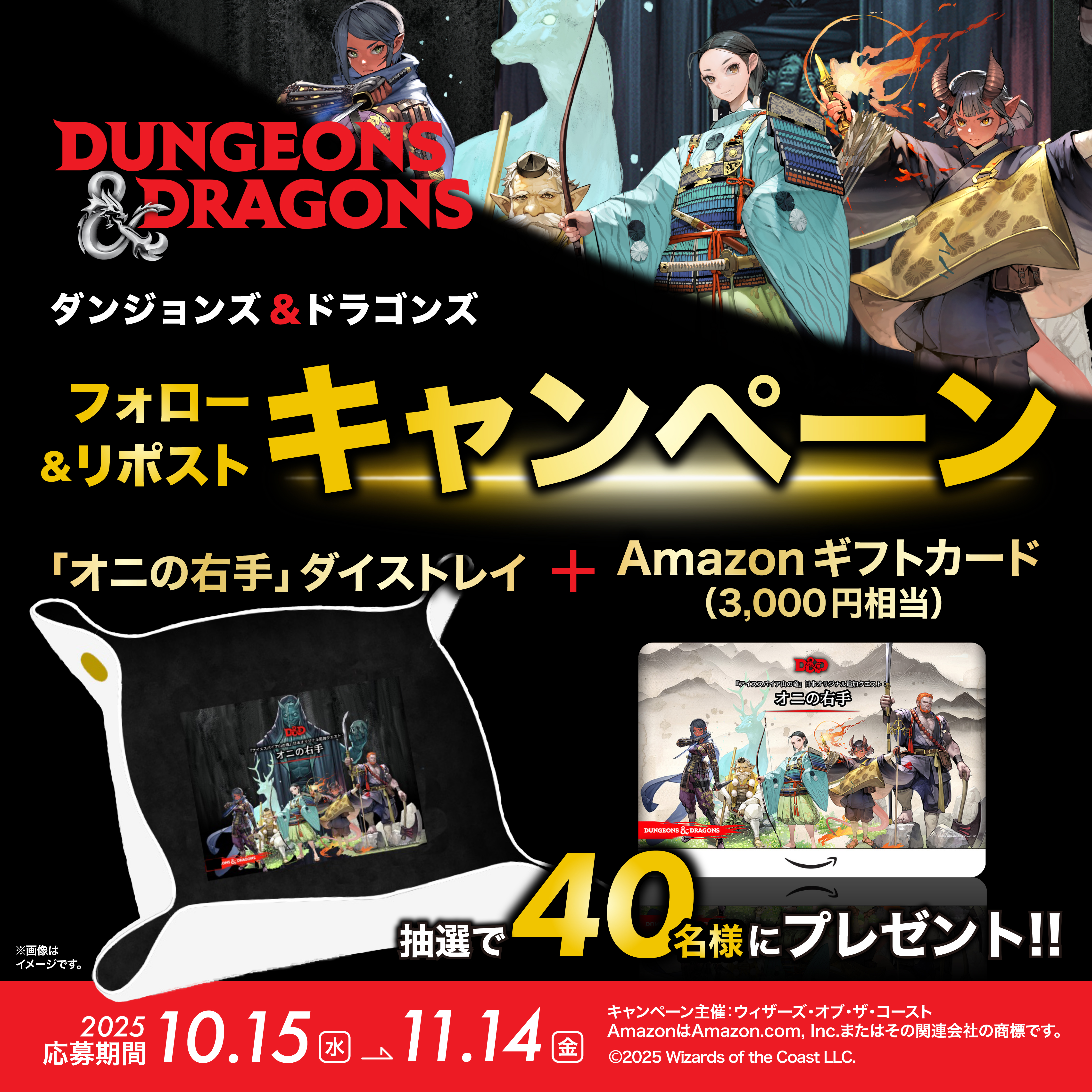 キャンペーンでは、Xをフォロー&該当のポストをリポストいただいたお客様から抽選で、オリジナルの「オニの右手」ダイストレイと3,000円分のAmazonギフトカードが40名様に当たります。