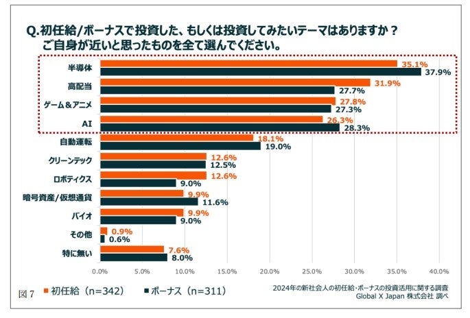 今年の新社会人が投資したいテーマとして最も多く選ばれたのは、初任給・ボーナス共に「半導体」でした。続いて、「高配当」「ゲーム&アニメ」「AI」といったテーマが 20%を超える結果となりました。(図 7)