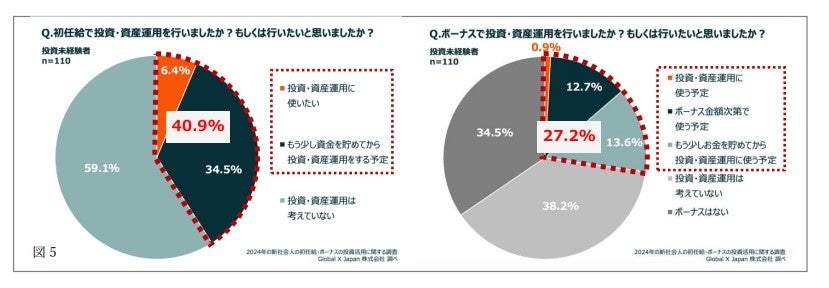 一方、投資経験のない今年の新社会人も投資意欲が全く無いわけではなく、6.4%が初任給を投資に使う予定、またもう少しお金を貯めたら投資をする予定である人が 34.5%と、合わせて 40.9%の人が投資をする意向であることがわかりました。(図 5.左)