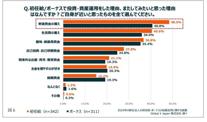 今年の新社会人の投資目的としては、生活費や趣味・娯楽、結婚や子ども関連といった短期・中期的な目的よりも、「老後資金の備え」という長期的な目的が最も多く回答されました。(図 6)