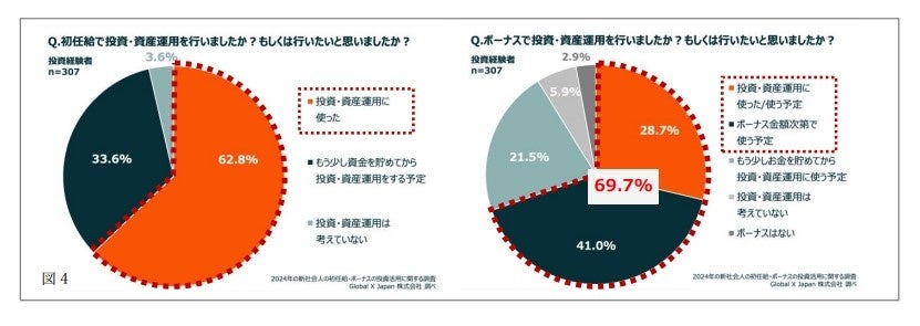 投資経験のある今年の新社会人のうち、62.8%が初任給で投資を行い、ボーナスも 69.7%が投資に使う予定となっており、新社会人となって初めて自分で稼いだ給与・ボーナスも投資に活用する志向であることがわかります。(図 4)