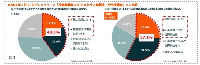 なお先月公開した「投資経験者の ETF に対する理解度・活用度調査」では、20 代〜50 代の投資経験者全体では ETF の理解は 40.3%、ETF 活用割合が 17.5%、20 代においては理解が 57.1%、活用が 25.6%(図 3)と、どちらの数字よりも今回の対象の方が高いポイントで、投資経験者の中でも今年の新社会人の新 NISA と ETF の理解度は特に高いことがわかります。