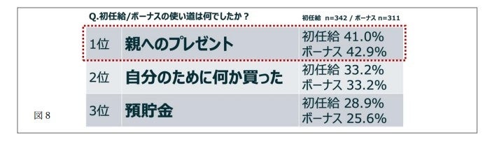 初任給とボーナスの使い道は、どちらも TOP3 は同じく1位「親へのプレゼント」、2位「自分のために何か買った」、3位「預貯金」となりました。今年の新社会人も、初任給やボーナスは自分のために使うことはもちろん、育ててくれた親への感謝の気持ちを忘れていないようです。(図 8)