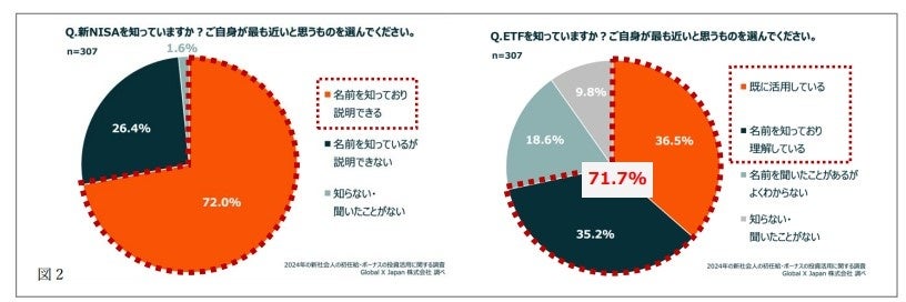 投資経験者の 72.0%が新 NISA の内容を理解。ETF も 71.7%が理解、36.5%が実際に ETF を活用していました。(図 2)