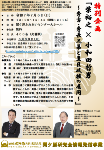 天下分け目の戦いの地「関ケ原」にある岐阜関ケ原古戦場記念館(以下、記念館)では、関ケ原研究会の情報発信事業として、戦国・織豊期の政治権力と社会についての研究を専門としNHK大河ドラマ「どうする家康」「豊臣兄弟!」の時代考証でもおなじみの柴裕之氏の講演、さらに、小和田哲男記念館館長と「秀吉・秀長兄弟と豊臣政権の展開」をテーマに、対談する特別企画を7月6日(日)関ケ原ふれあいセンター大ホールにて開催いたします。