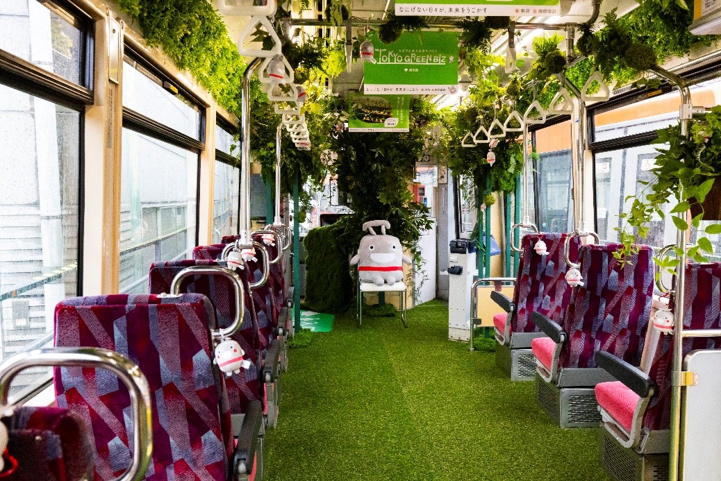 車両は「街を走る公園」をテーマに、都内に自生する植物など、本物の緑を生かして装飾。