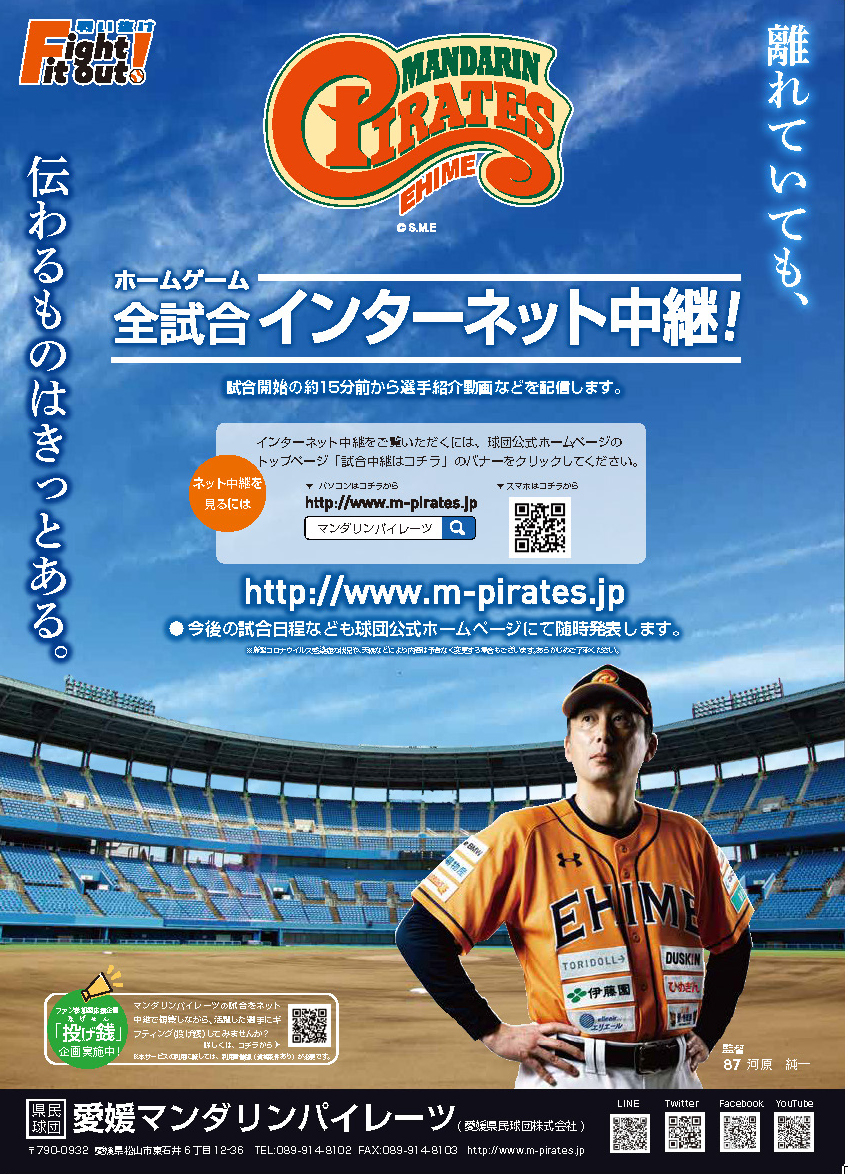 愛媛県民球団株式会社(本社:愛媛県松山市、代表取締役:薬師神 績)では、2020シーズンの愛媛マンダリンパイレーツのホームゲーム全38試合をインターネット中継することといたしましたのでお知らせいたします。