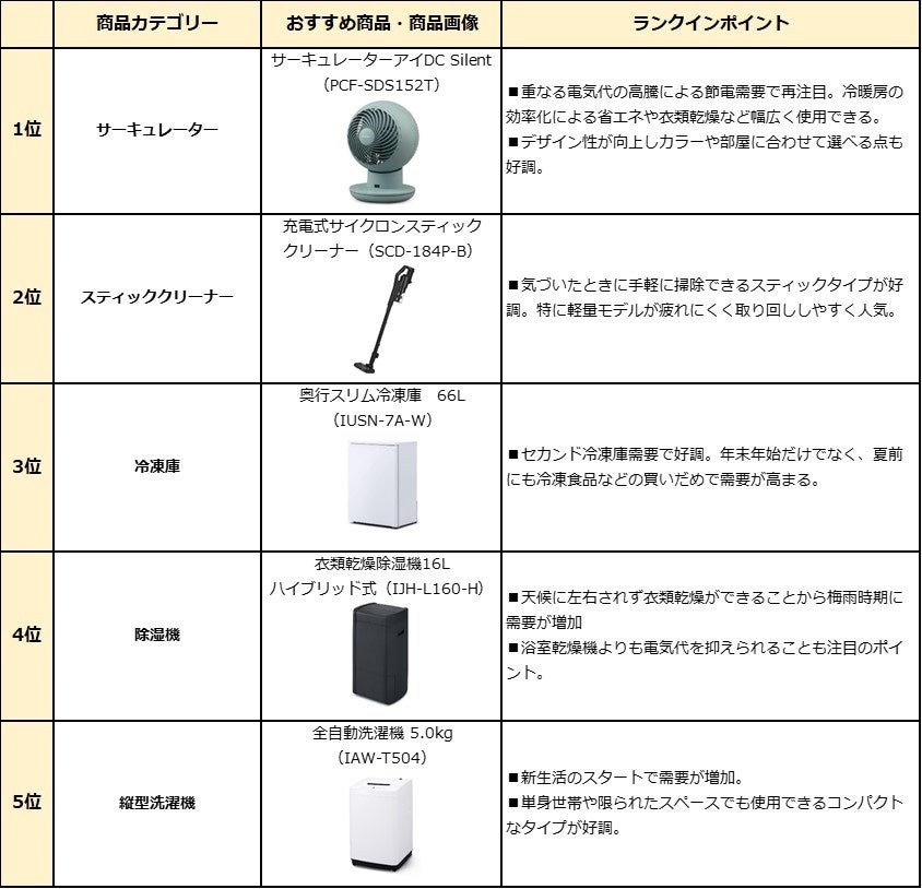 新生活・節電需要でランクイン商品多数!アイリスオーヤマ2023年上半期(※)売上ランキング家電・生活用品別にベスト5を発表