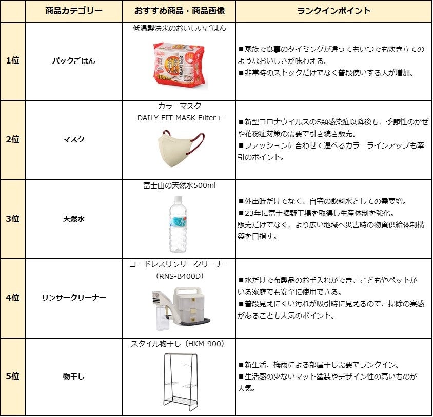 家電部門については新生活の準備や買い替え需要に加え、梅雨時期の部屋干し対策、物価・電気代高騰による節電需要に対応する商品を中心にランクインしています。第1位はコロナ禍から注目され、節電で再注目されているサーキュレーターが選出されました。換気だけでなく部屋干し時の衣類乾燥、冷暖房の効率化と年中使用できます。生活用品部門では、普段の食事はもちろん緊急時でも使用できる食品が好調な販売となり、第1位にパックごはんがランクインしました。家族で食事のタイミングが異なっても、当社の米事業で採用している低温製法によって手軽に炊き立てのようなごはんが食べられます。