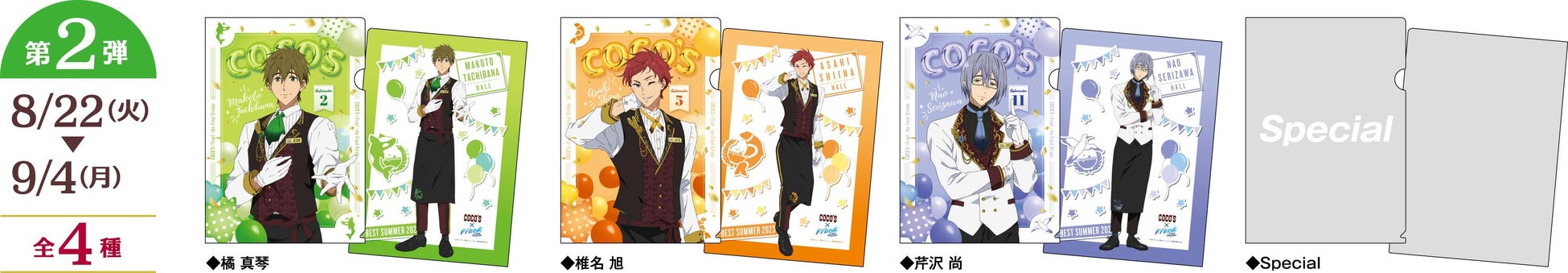 また、1ポイント毎に、前半と後半でデザインが切り替わる「ココスオリジナルA3ポスター Flower ver./Balloon ver.」が各100名様(合計200名様)に当たるWEB抽選に応募できます。さらに、累計応募回数に応じて七瀬遙(ななせはるか)(CV.島﨑信長(しまざきのぶなが))、橘真琴(たちばなまこと)(CV.鈴木達央(すずきたつひさ))、松岡凛(まつおかりん)(CV.宮野真守(みやのまもる))、桐嶋郁弥(きりしまいくや)(CV.内山昂輝(うちやまこうき))、山崎宗介(やまざきそうすけ)(CV.細谷佳正(ほそやよしまさ))によるオリジナルストーリーボイス(全13種類)を聴くことができます。