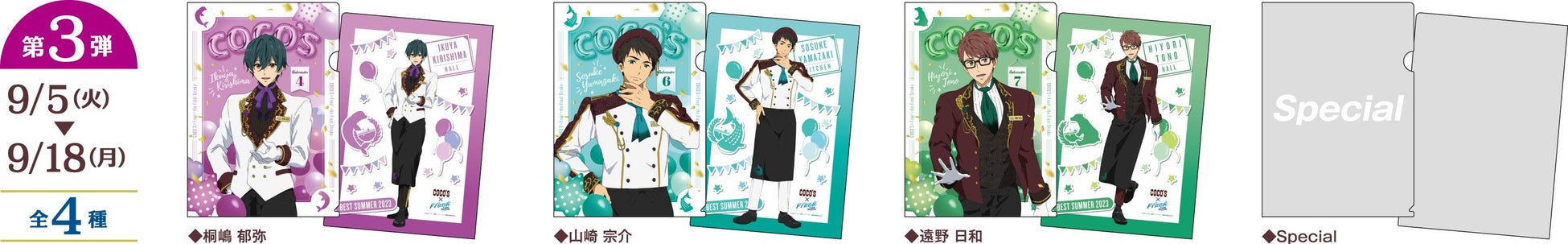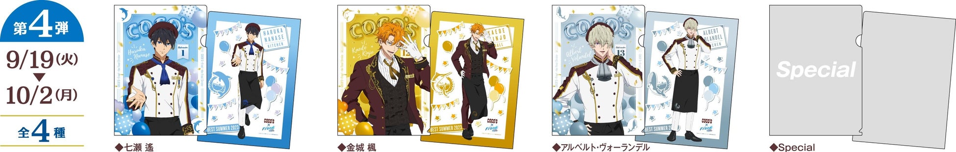 また、『劇場版 Free!–the Final Stroke–』に登場するキャラクターや作品をイメージしたコラボメニューを販売します。コラボメニューを含む対象メニューから1品のご注文につき、ココスオリジナルクリアファイル(A4)を1枚プレゼントします。