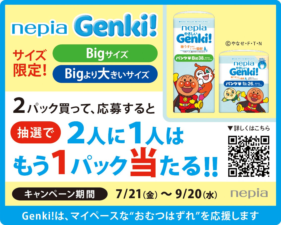 “赤ちゃんも、ママパパも、おむつストレスフリー”をめざす「ネピア Genki!」は、赤ちゃんの成長の証である「おむつのサイズアウトロス問題」に続き、今回は赤ちゃんのおむつが思うようにはずれないことが親の大きな心配事になっていることに着目。その悩みに寄り添い、サポートするために、おむつはずれに対する意識が高まる大きめサイズ(Bigサイズ・Bigより大きいサイズ)を対象として、Genki!を2パック買って応募すると、抽選で2人に1人の確率で“もう1パック当たる!” 『マイペースな“おむつはずれ”を応援!キャンペーン』を実施します。