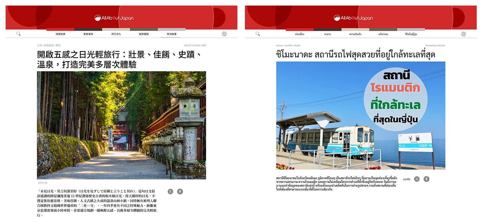 「All About Japan(オールアバウトジャパン)」は、2015年にスタートした、海外向けに多言語(全6言語:英語、中国語【簡体字、繁体字】、タイ語、韓国語、日本語)で日本の文化・観光情報を発信するサイトです。外国人目線で日本の魅力を海外へ伝えるため、ネイティブスピーカーの編集者が、各国の嗜好を踏まえた日本情報を調査・発信しています。