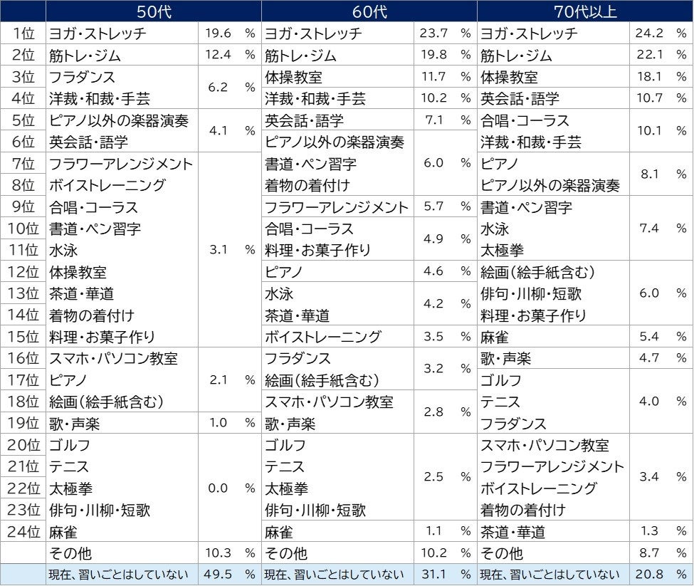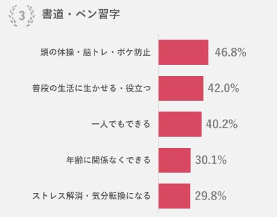 数十件ではありましたが、自由記述に「達成感」「上達」という言葉を見つけました。いくつになっても「達成感を得たい」「上達したい」ということを習いごとに期待していました。この動機は、幼少期や青年期に始める稽古ごとと何ら変わりません。老い先短くとも、「現状維持」「予防・防止」だけではなく、「上達」「向上」を求めていると解釈できます。元来、お稽古は「古(いにしえ)を稽(かんがえる)」が語源で、「日本古来の伝統芸能など、先人の考えから学ぶ」という意味を持つそうです。3位に書道・ペン習字がランクイン。そのほか、俳句・川柳・短歌、日本舞踊、茶道、着物など和の習いごとが目立ちました。新しいスキルを身につけるには、まず、先人に思いをはせる。次に、今の自分と向き合い、そして、未来を考えて継承していく覚悟が必要です。スキルアップは、健やかな精神を育むことにもつながります。