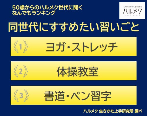 【50歳からのハルメク世代に聞く なんでもランキング】50歳以上の女性が選ぶ「同世代にすすめたい習いごと」ベスト3は 1位『ヨガ・ストレッチ』、2位『体操教室』、3位『書道・ペン習字』