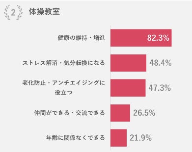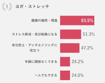 理由1位は「健康の維持・増進」、2位は「ストレス解消・気分転換になる」、3位には「老化防止・アンチエイジングに役立つ」があげられた。4位「年齢に関係なくできる」、5位には「一人でもできる」が入っている。