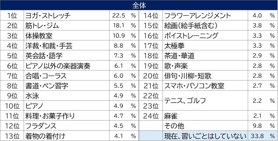 現在習いごとをしていない人は33.8%いました。新年という節目に、何か新しいことを始めたり、学び直しをしたりしてはどうでしょうか。既に習いごとをしている人は、これまで努力してきた習いごとの実を結ぶ年にしてはどうでしょうか。いくつになっても、始めること、達成感を得ること、上達することはワクワクすることですから。充実したすてきな1年となりますように。