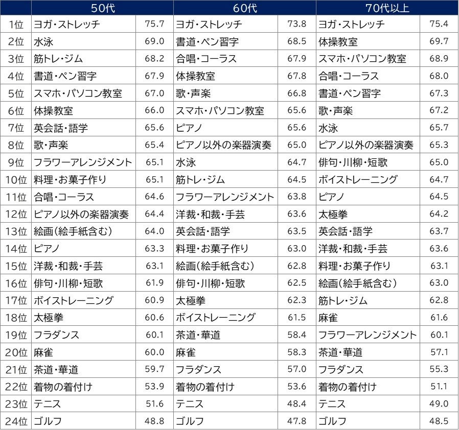 平均年齢64.9歳女性が【同世代にすすめたい習いごと】は、1位ヨガ・ストレッチ、2位体操教室でした。なお、【現在、実際に行っている習いごと】も、1位ヨガ・ストレッチ、2位筋トレ・ジム、3位体操教室と、〝自分の体と向き合う系″。「健康維持」「ストレス解消・気分転換」「老化防止」「年齢に関係なくできる」がすすめたい理由でした。これらは、当該世代に共通する顕在化した欲求と言えるでしょう。