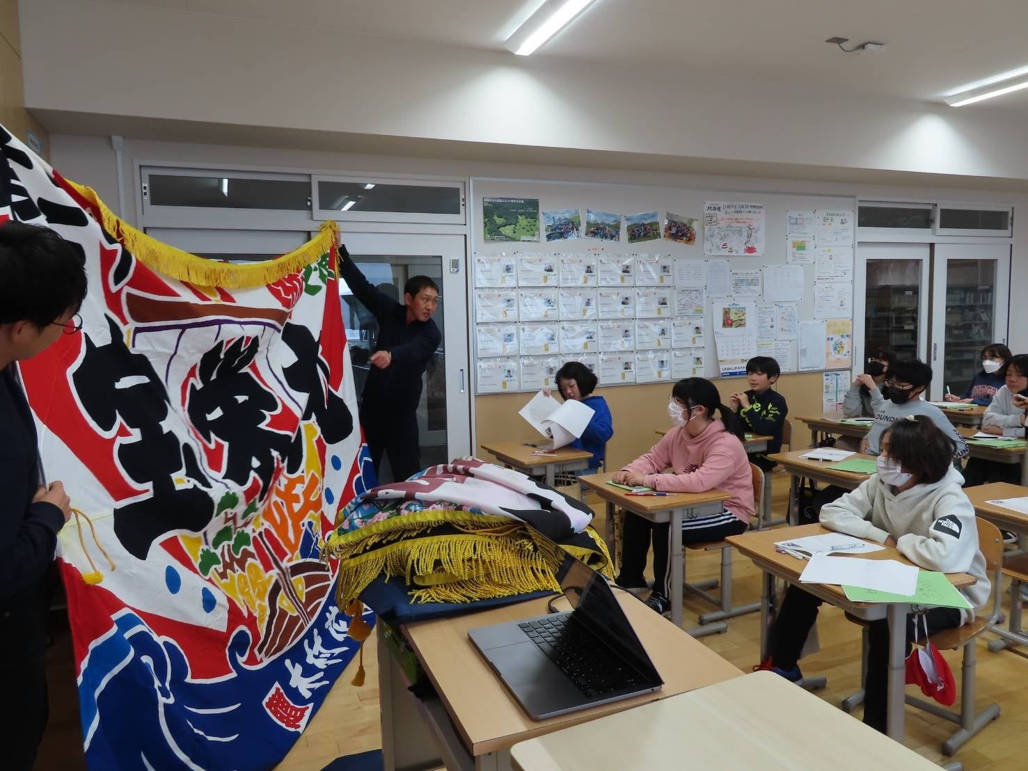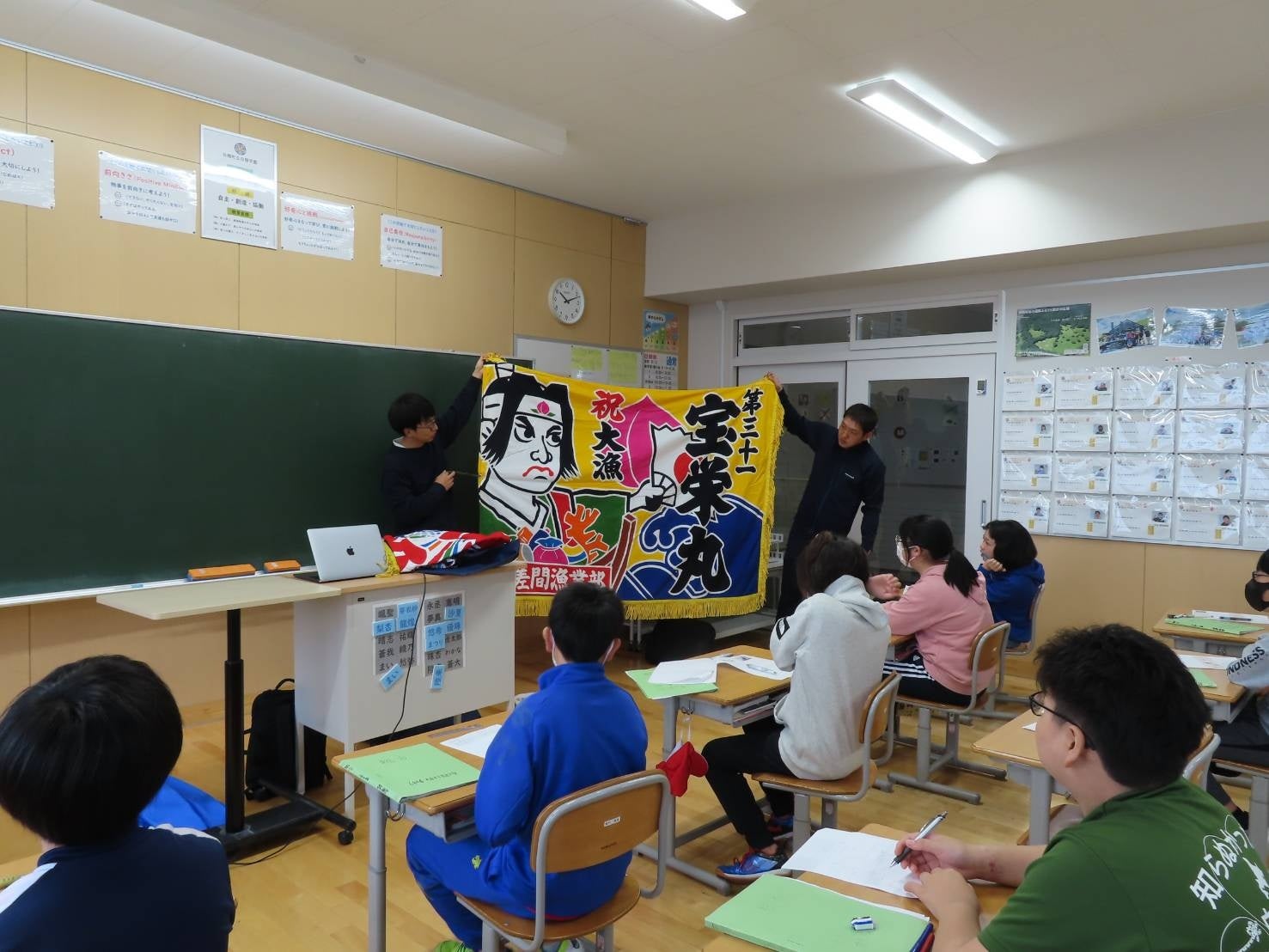 白糠学園の卒業生で、現在は「第三十一 宝栄丸」の船長として、また白糠漁業協同組合の定置網部会会長としても活躍されている木村船長からは、「漁師ってどんな仕事?」というテーマで、実際の漁の様子をお話ししました。実物の「大漁旗」も披露し、児童たちからは「かっこいい!」という声が上がっていました。