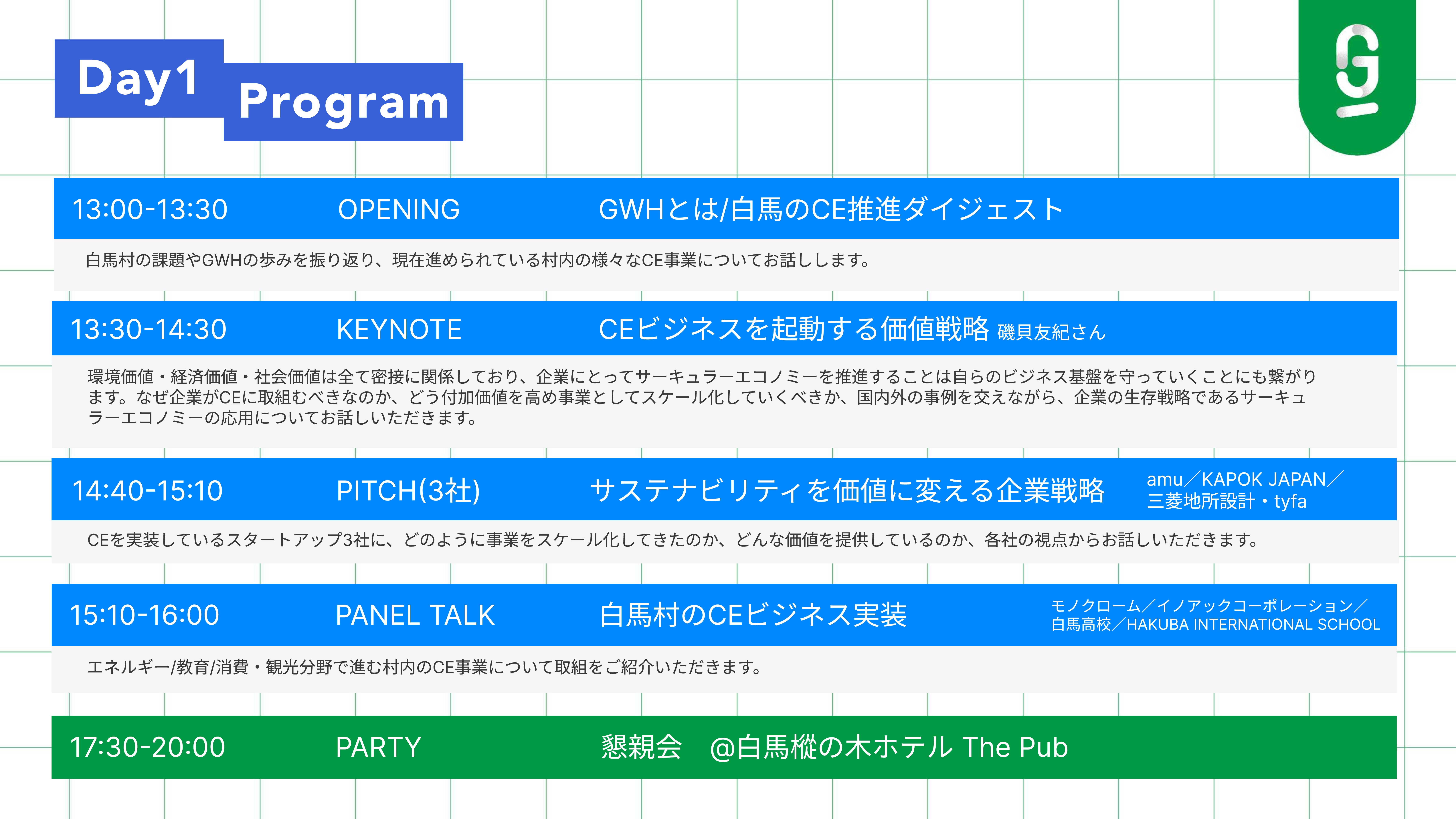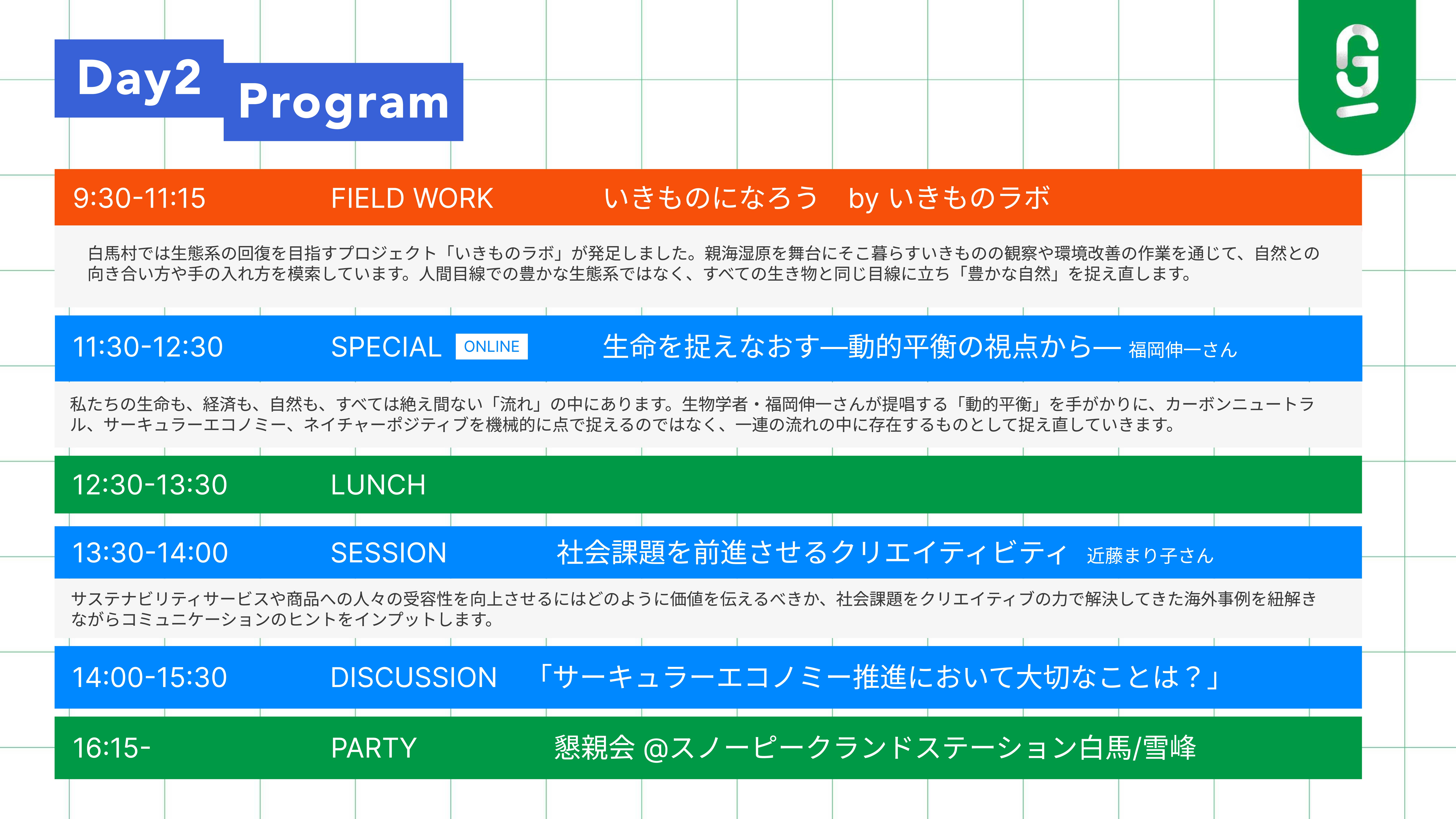 内容:サーキュラービジネス実現に向けたカンファレンス、白馬村の生物多様性を考えるフィールドワーク、各フィールドを超えた創発を目指すディスカッションなど