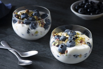 ①ヨーグルト、ブルーベリー、ピスタチオを、2杯のグラスに層のように盛ります。