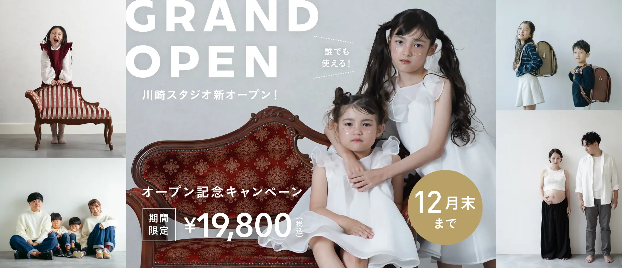 川崎フォトスタジオでは、オープンを記念して、特別なキャンペーンを開催中。七五三や家族写真など人気シーンの撮影を、期間限定の特別価格で体験いただけます。