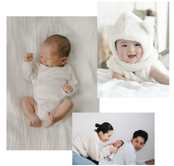 ママも赤ちゃんも安心できる環境で、初めてのスタジオ撮影にぴったりな、赤ちゃんのための特別な「ベビーフォトプラン」。成長のスピードが早い時期だからこそ、今しか残せない赤ちゃんの表情や仕草を丁寧に切り取ります。