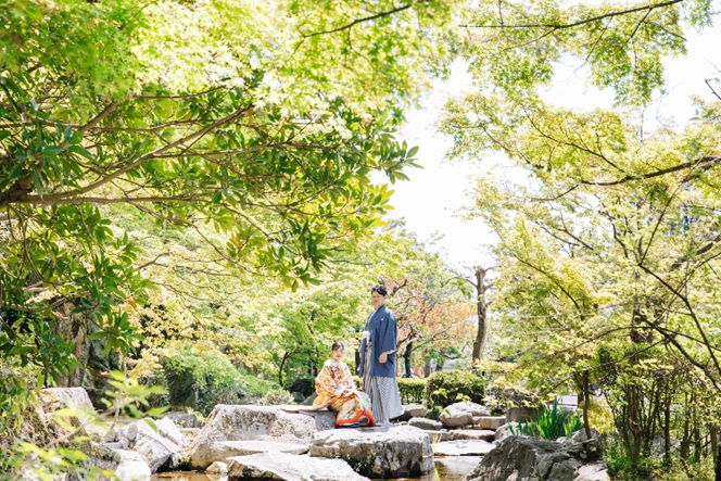 ドレスにぴったりなクラシカルな洋館「萬翠荘」や、瀬戸内海を一望できる「モンチッチ海岸」、自然豊かな「上林森林公園」など、松山ならではの多彩な魅力を楽しめる全撮影データがセットになったプランです。春の桜、秋の紅葉は特に人気のシーズン。どの季節でも美しい結婚写真が残せます。