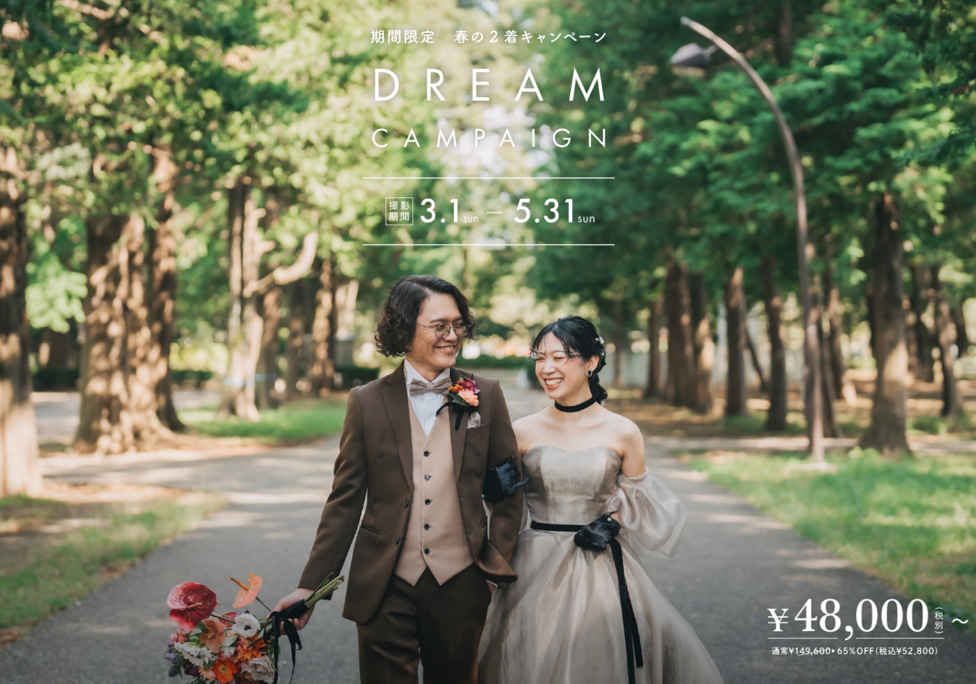 対象期間に新規相談・ご成約の方に限り「春の衣装2着+全データ込」が最大65%OFFで受付中。この春に撮影を検討される方にピッタリのお得なキャンペーンです。