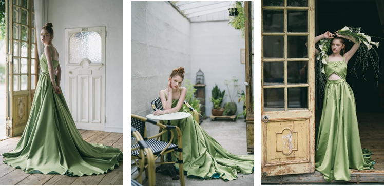ライムカラーが爽やかでヘルシーなMerā。シンプルで独創的なデザインにエンパワーメントを感じさせるドレスです。