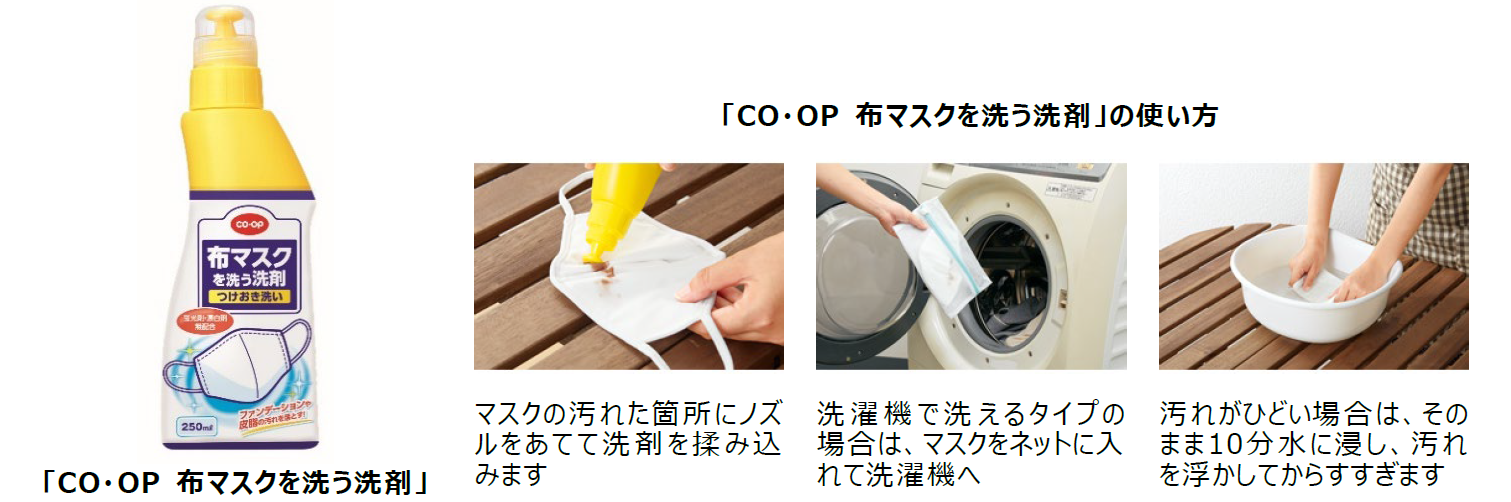 今回発売する「CO・OP 布マスクを洗う洗剤」は、ファンデーションや、口元についた食べ物による汚れなど、マスクに付きやすい汚れに着目して開発した洗剤です。布マスクだけでなく、洗って繰り返し使えると表示されたマスクに使えます。