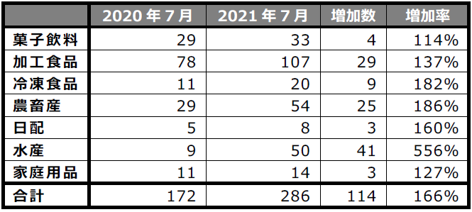 再生・植物由来プラスチック使用包材の品目数は、172品目(2020年7月時点)から286品目(2021年7月時点)と、1年間で1.5倍以上となりました。