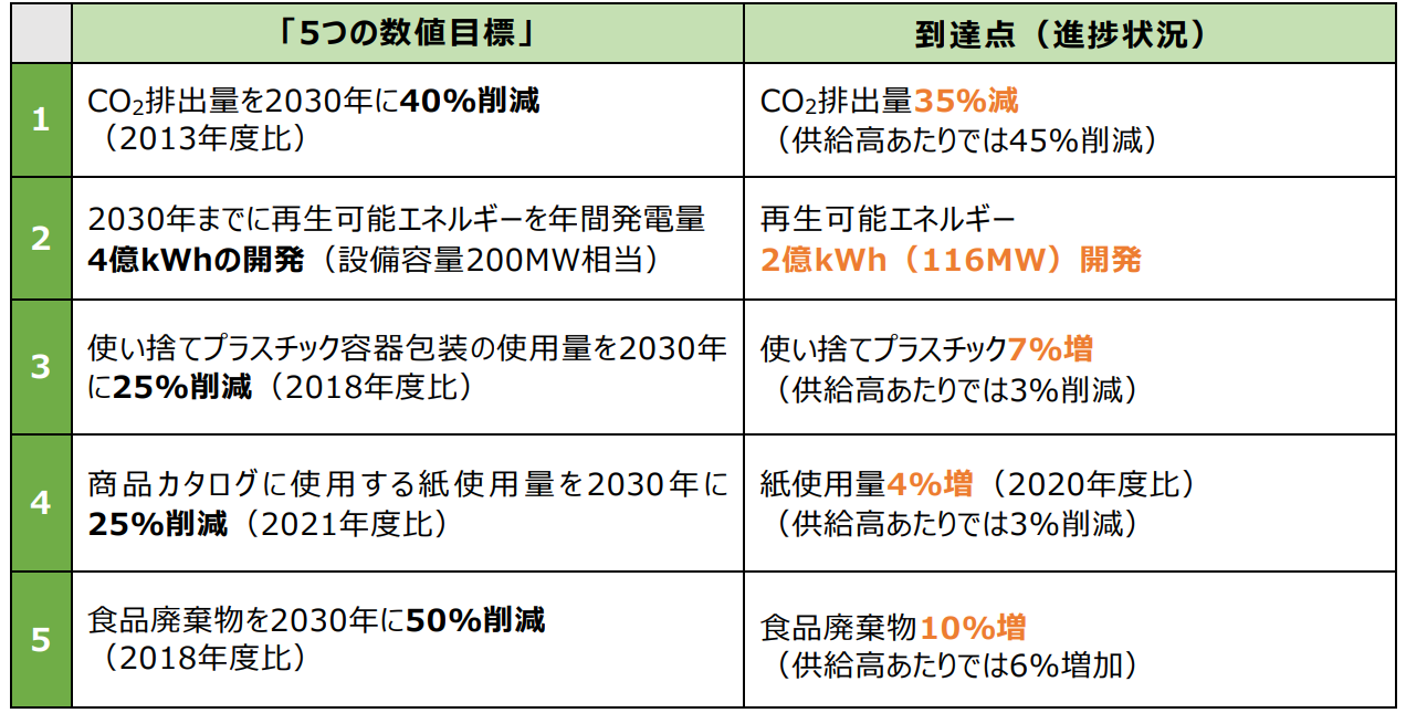 日本生協連と全国の生協は「生協の2030環境・サステナビリティ政策」で定めた5つの数値目標の達成に向けた取り組みをおこなってきました。これまで事業活動等を通じてCO2排出量の削減や再生可能エネルギーの開発などに積極的に取り組み、課題は残るものの、一定の成果を得てきました。