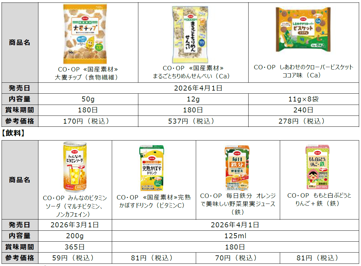 このたび、組合員自身や家族、子どもの健康づくりに役立てていただける、カルシウムや鉄分、ビタミン、食物繊維などの新商品、菓子7商品、飲料4商品を発売します。