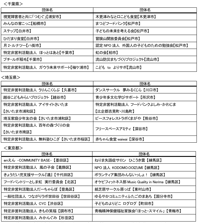 ・応募資格概要:公益を目的とした団体で、千葉県、埼玉県、東京都に活動拠点があり、すでに活動しているか、活動を立ち上げようとしている団体であること。