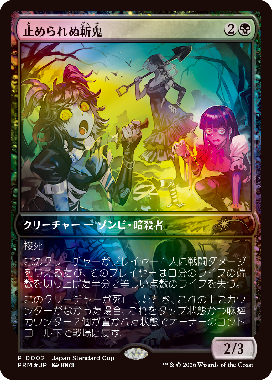 全5回戦で全勝のプレイヤーには、プロモ版《止められぬ斬鬼》(日本語・FOIL仕様)と《幽霊による庇護》が描かれた特別なプレイマットがおくられます。プロモーションカードのアートは「HNCL」さんが手掛けています。