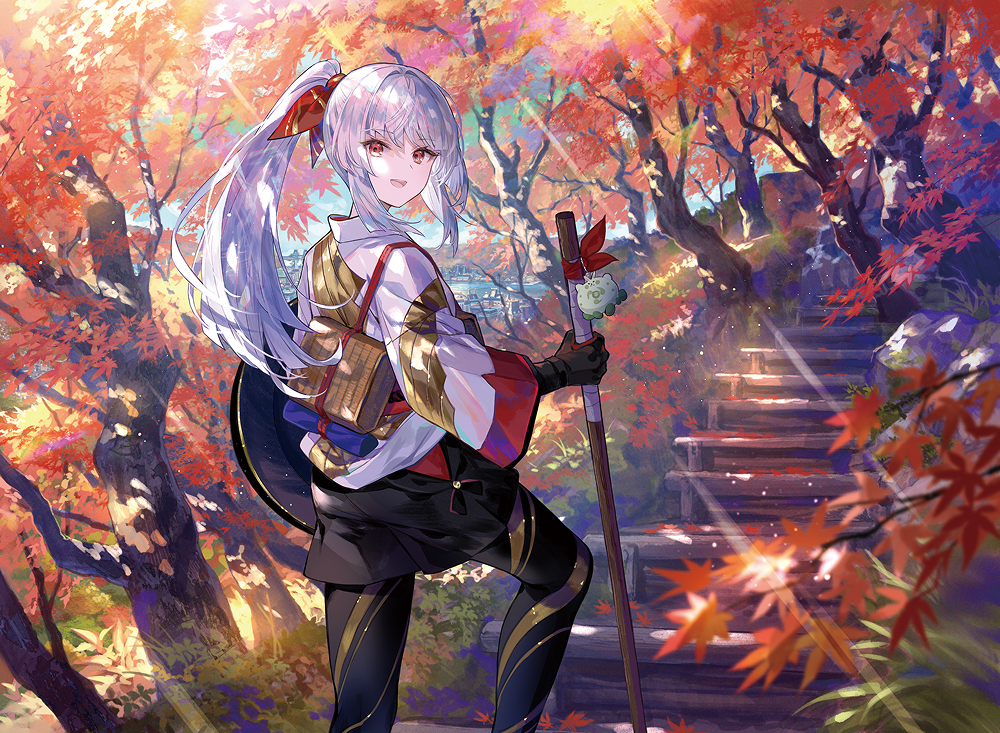 最後に描いた4枚目の秋は、他の季節と違って放浪皇1人なので、色々なシチュエーションを想像する余地のある1枚ですね!汗一つかかず軽々と山道を登っていく放浪皇が眩しいです。衣装は、江戸時代の旅装束からインスピレーションを受けました。山間から神河の街並みがのぞいているのがポイントです。