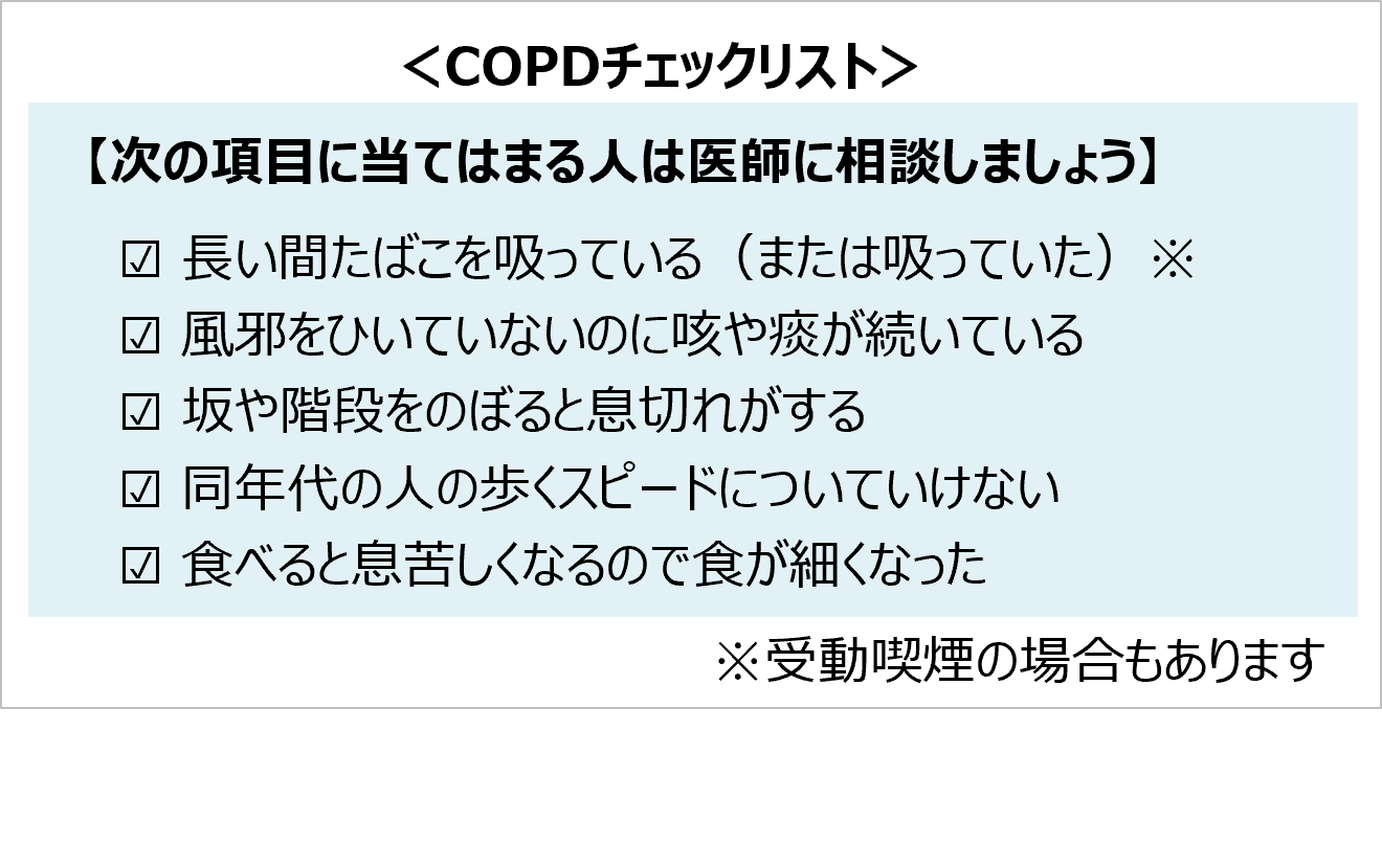 ※1 世界各国でCOPDへの関心を高めることを目的に、GOLD(the Global initiative for chronic Obstructive Lung Disease: “慢性閉塞性肺疾患に対するグローバル・イニシアティブ”)が、毎年11月の第三水曜日を「世界COPDデー」として2002年に制定
